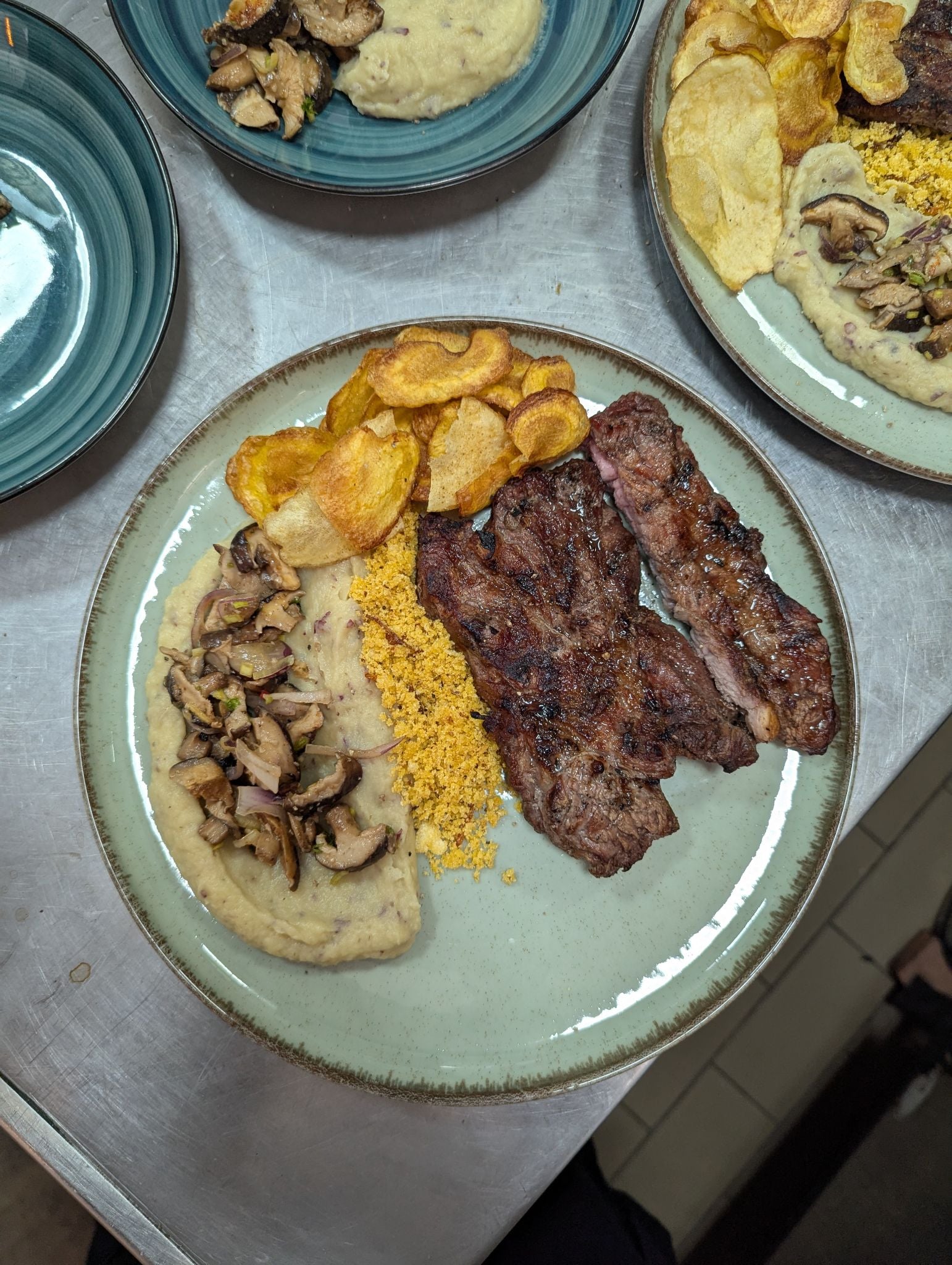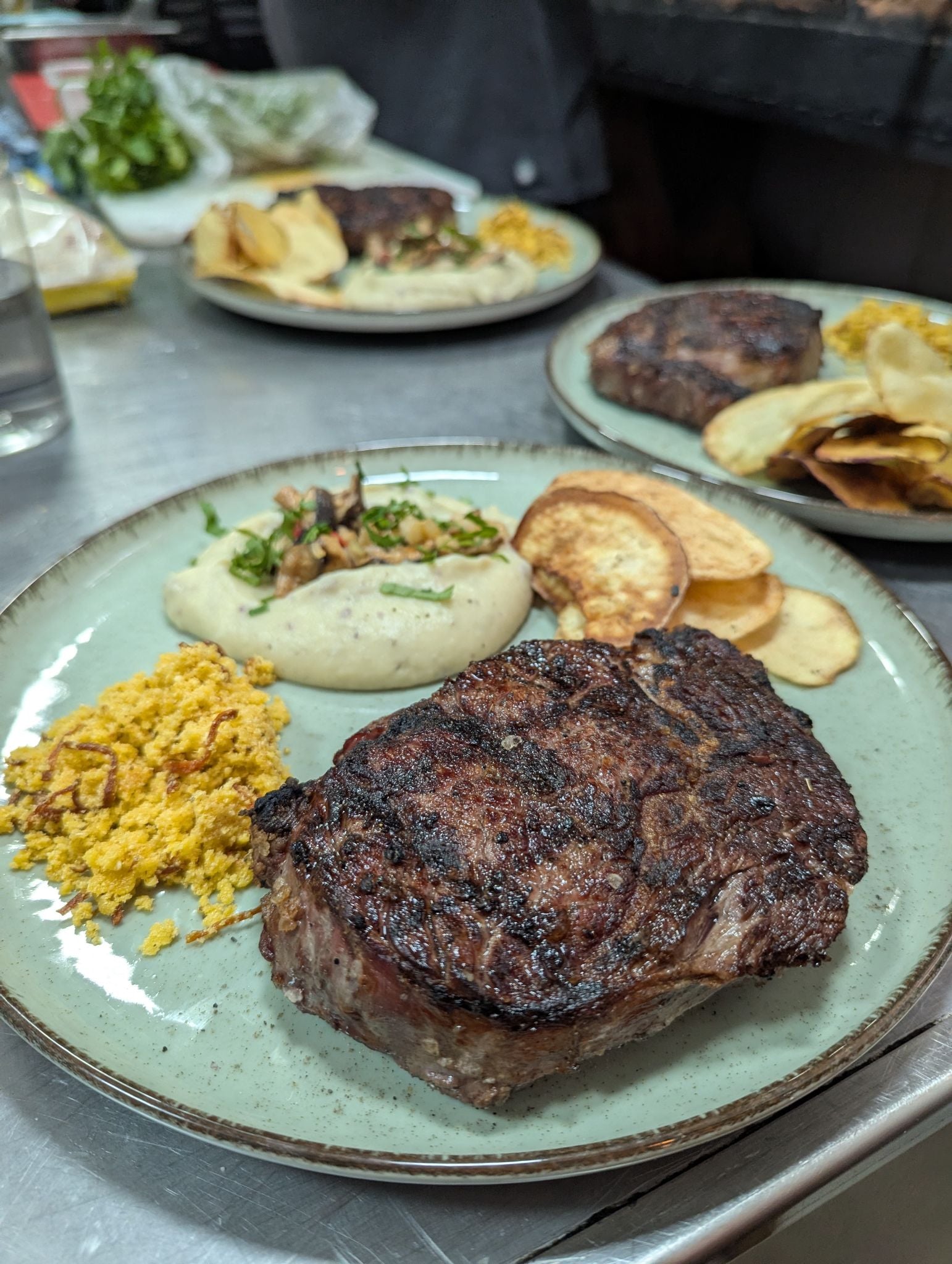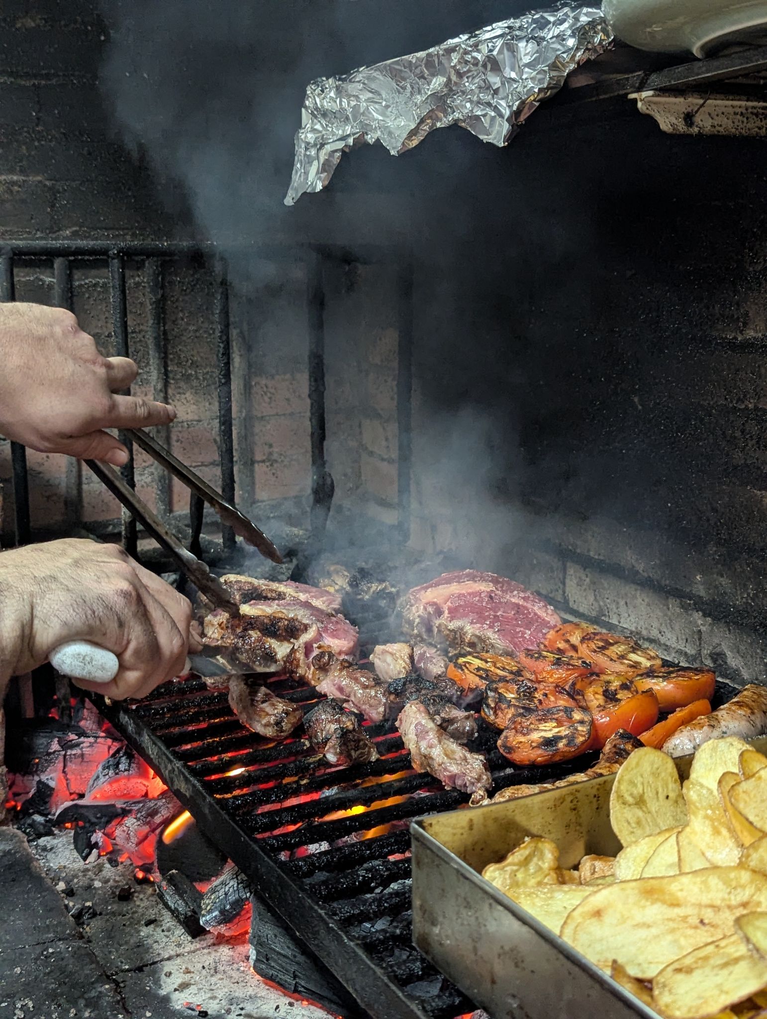 Trabalhamos com cortes de carne preparados na parrilla, como bife de chorizo, picanha de cordeiro, maminha e brisket, além de truta fresca, omelete com shitake e vegetais grelhados.